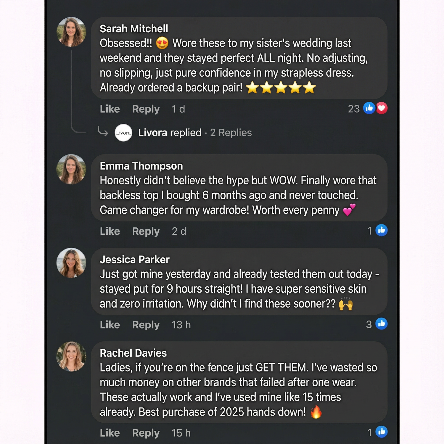 Livora inserts are designed to work for all sizes. You can wear them inside your existing bra for extra lift, or stick them directly to your skin for strapless/backless styles. They adapt to your unique shape.